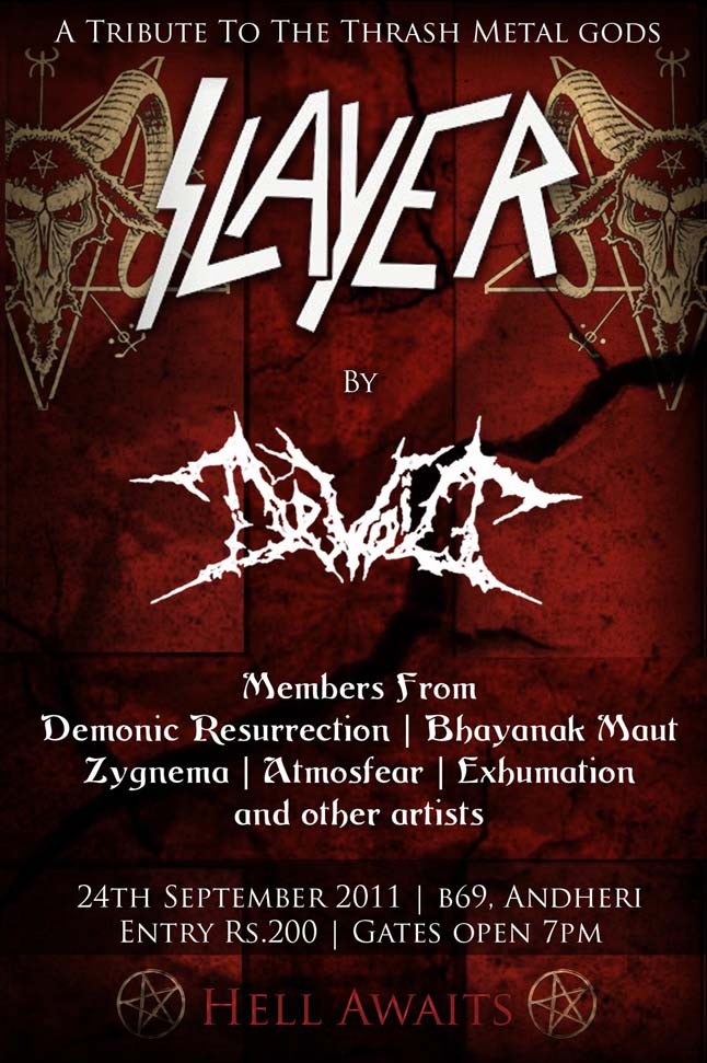 India is going to host 1st time ever Slayer tribute gig on 24th September 2011. This whole event is organized by Mumbai Death Thrash Metal band Devoid. They are also going to join on stage by members of Demonic Resurrection, Bhayanak Maut, Zygnema, Atmosfear , Exhumation and others. The event will also host a screening session of slayer videos prior to the gig